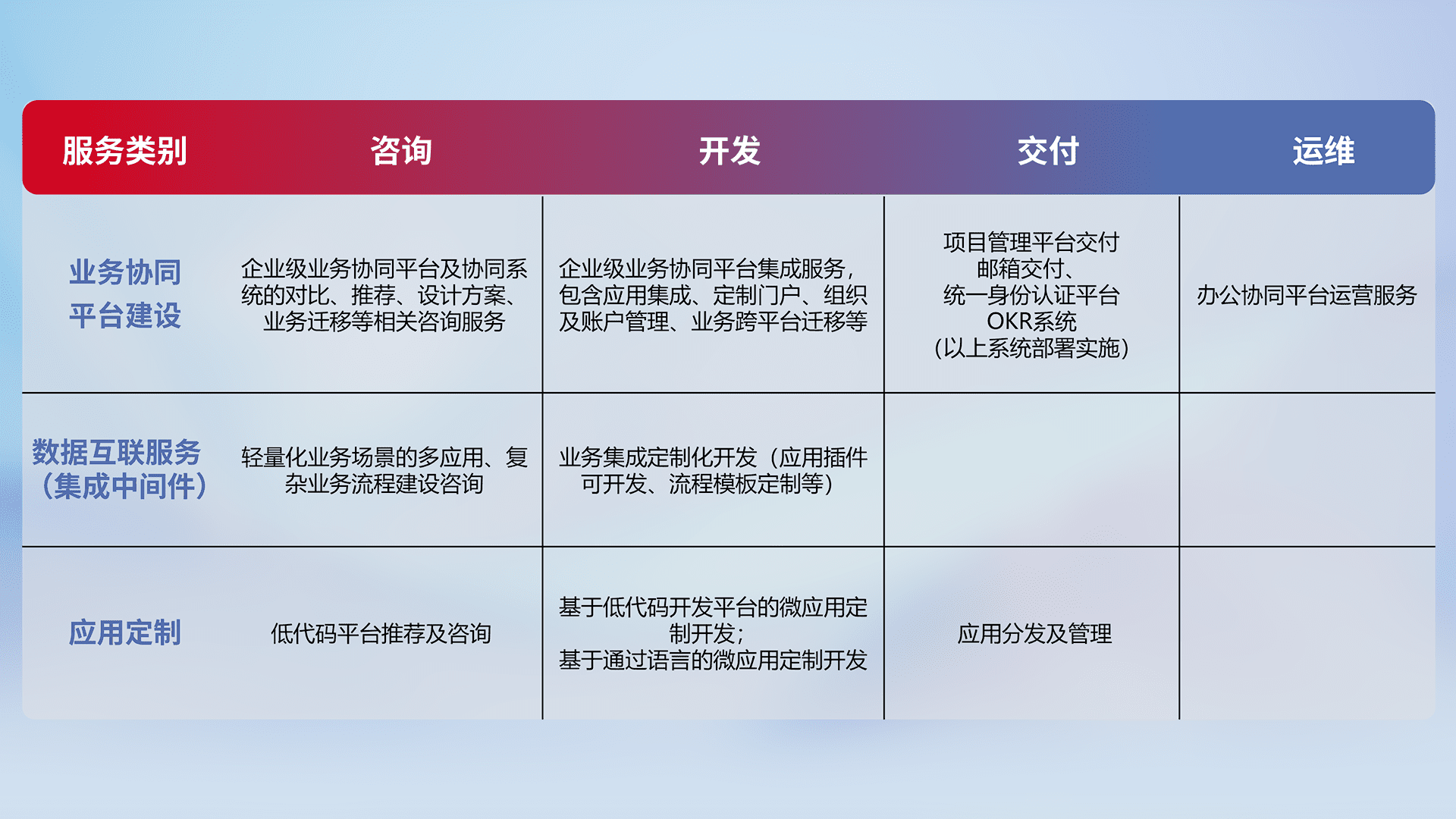 针对钉钉、、、企微、、IDaas等平台级产品提供产品的规划、、、、方案、、、、交付、、、定制化开发等服务,,,实现如统一协同办公、、、智能客户服务、、、、混合会议管理、、智能数据查询、、、等业务场景,,,,实现数字化转型。。。。